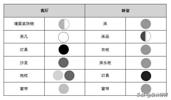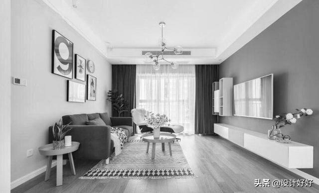 如果我们去掉颜色,从黑白灰的关系上看,对颜色的深浅更直观一些。其实深浅搭配并不一定是按照上述规则进行。通常浅色面积大。中性色面积小,深色点缀,这样空间的色调是浅色为主,空间比较明亮,像上图客厅。